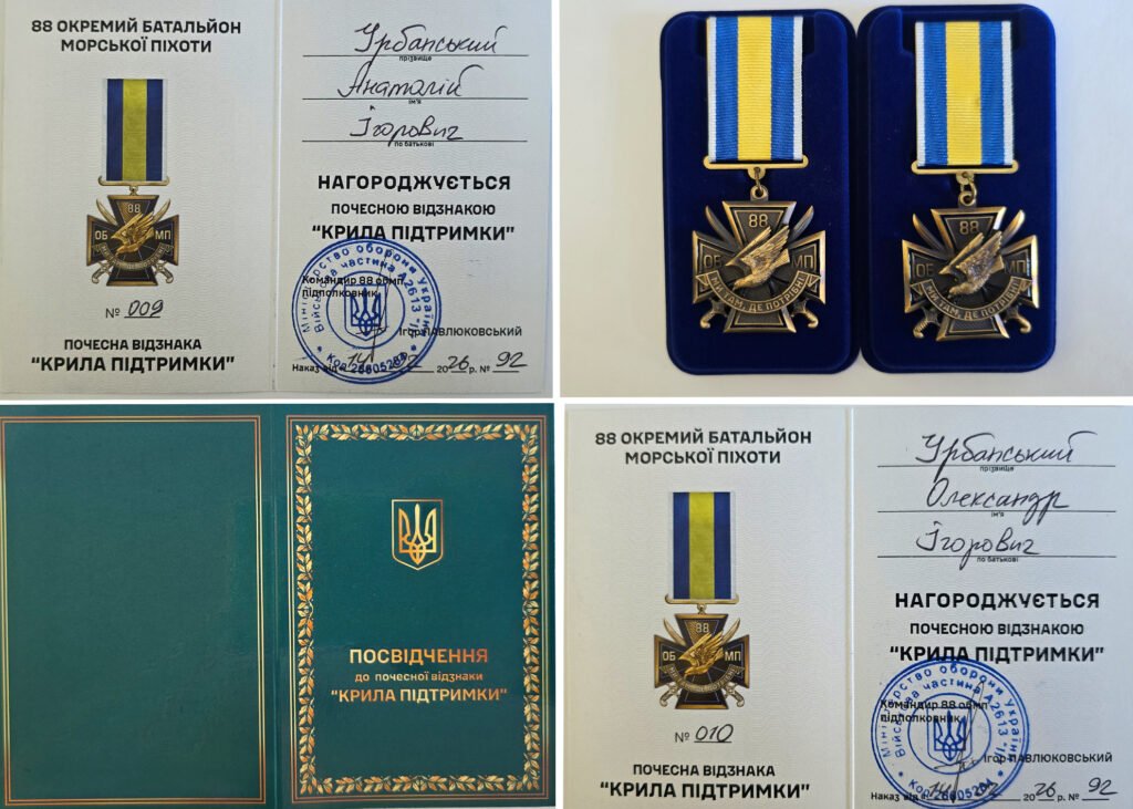 На днях соучредители Благотворительного фонда Урбанских «Придунавье» — Анатолий Игоревич и Александр Игоревич Урбанские — получили Почётную награду «Крила підтримки» из рук Игоря Павлюковского — командира 88-го отдельного батальона морской пехоты 35-й отдельной бригады морской пехоты имени контр-адмирала Михаила Остроградского.